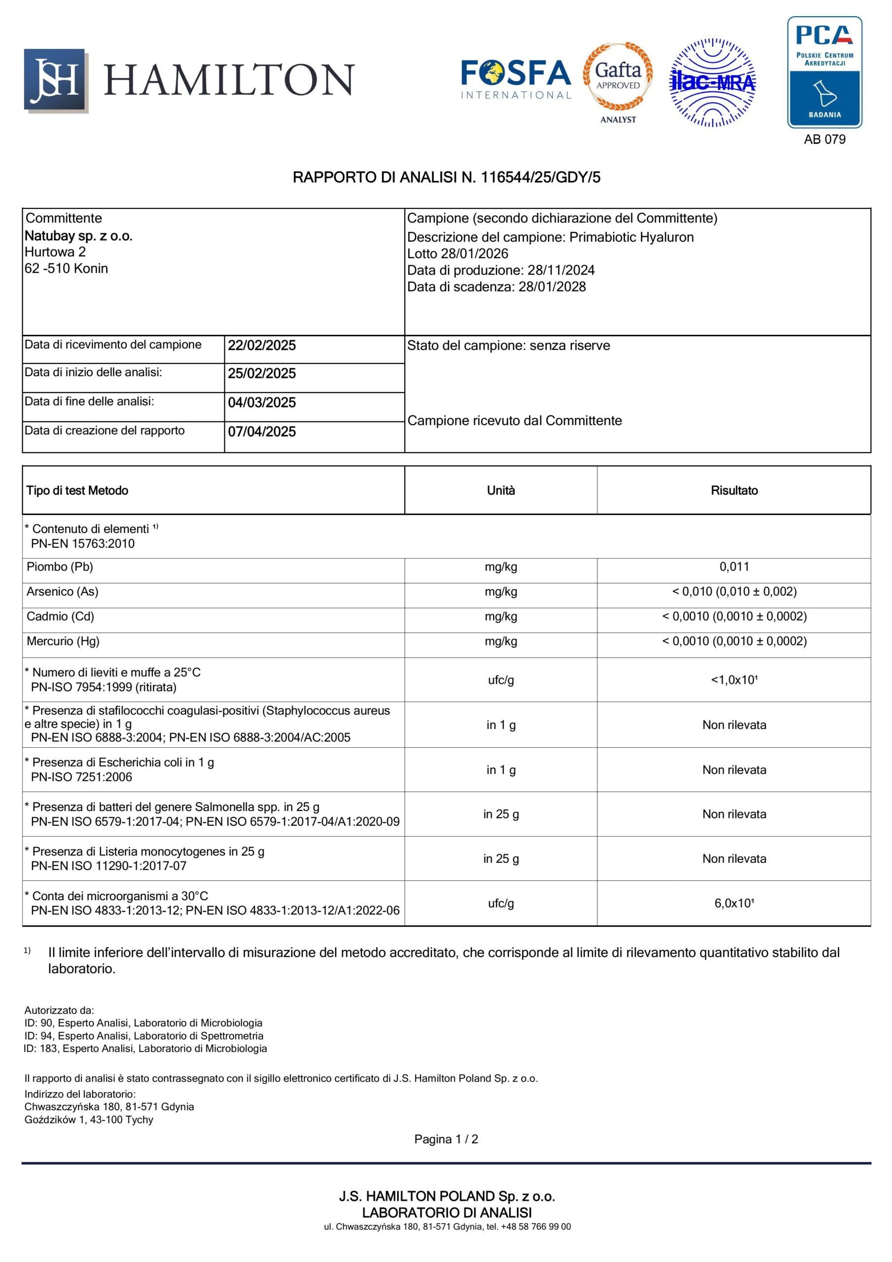 Le analisi di purezza microbiologica confermano l’assenza di metalli pesanti.